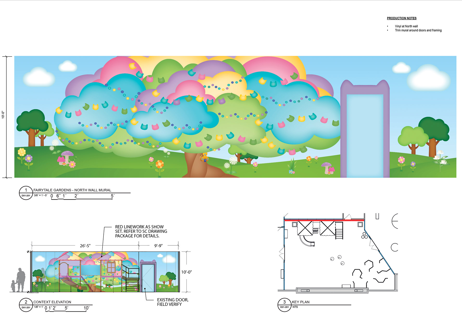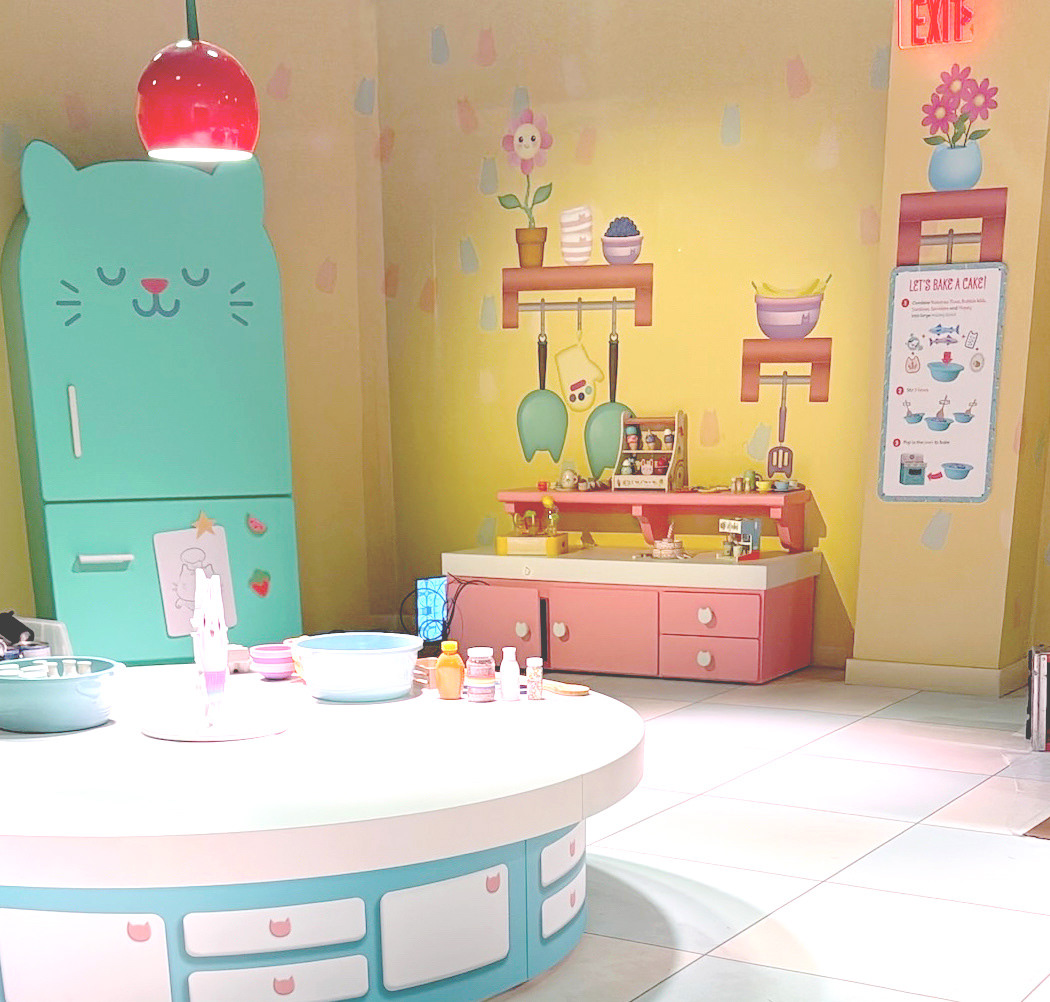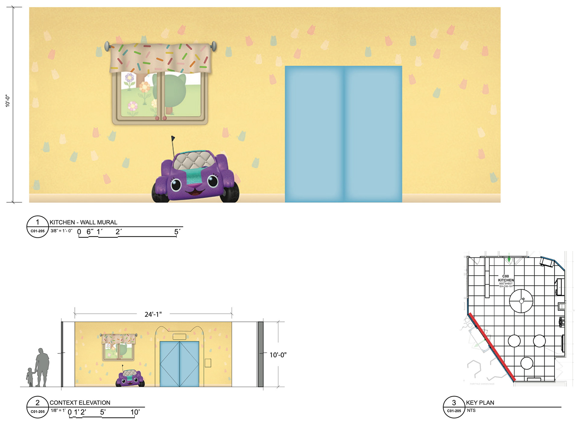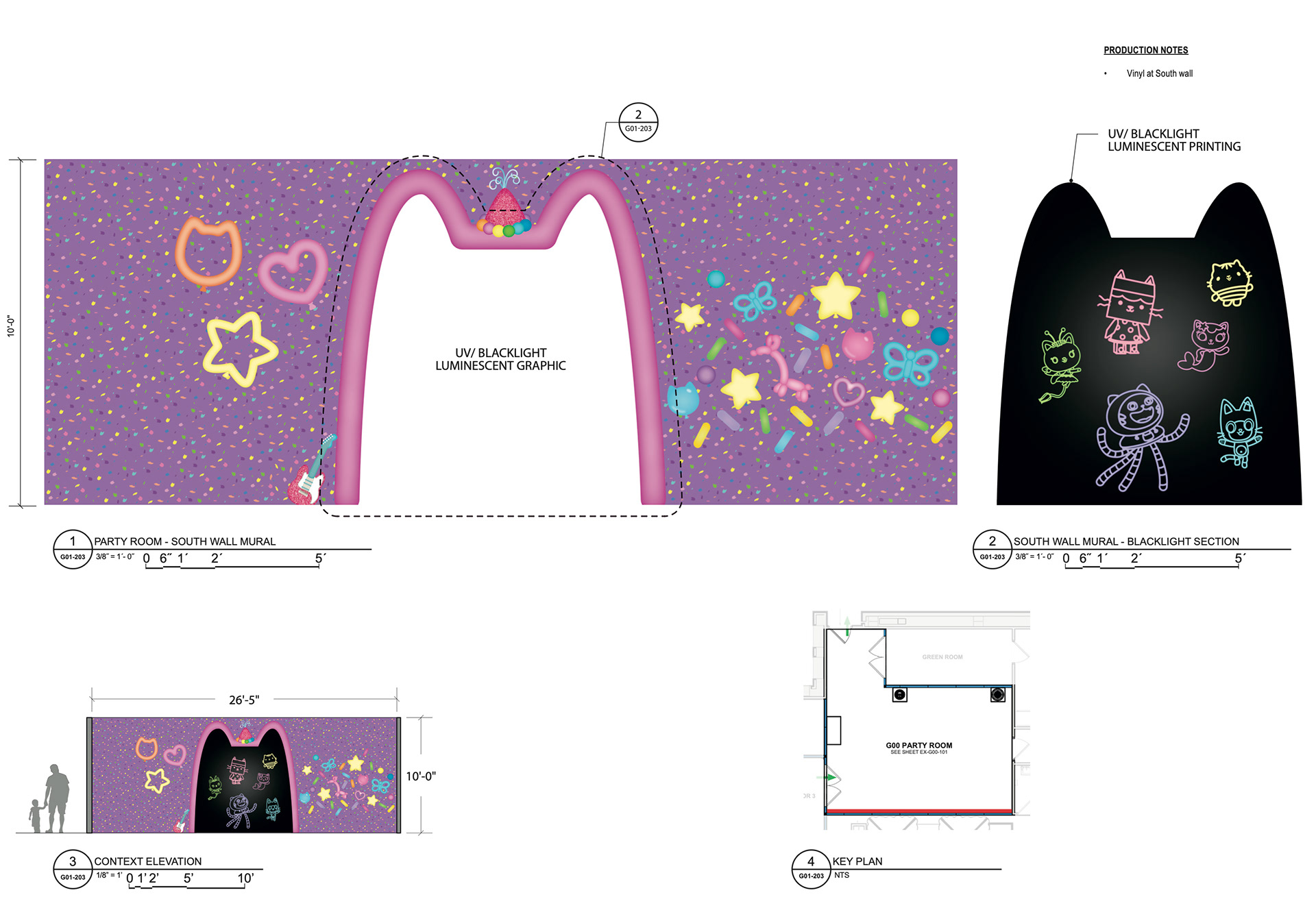 Floor to ceiling printed vinyl graphics to create rooms from Gabby's Dollhouse for kids and families to enjoy in real life. Designed concept through creating print-ready files and design detail sheets.