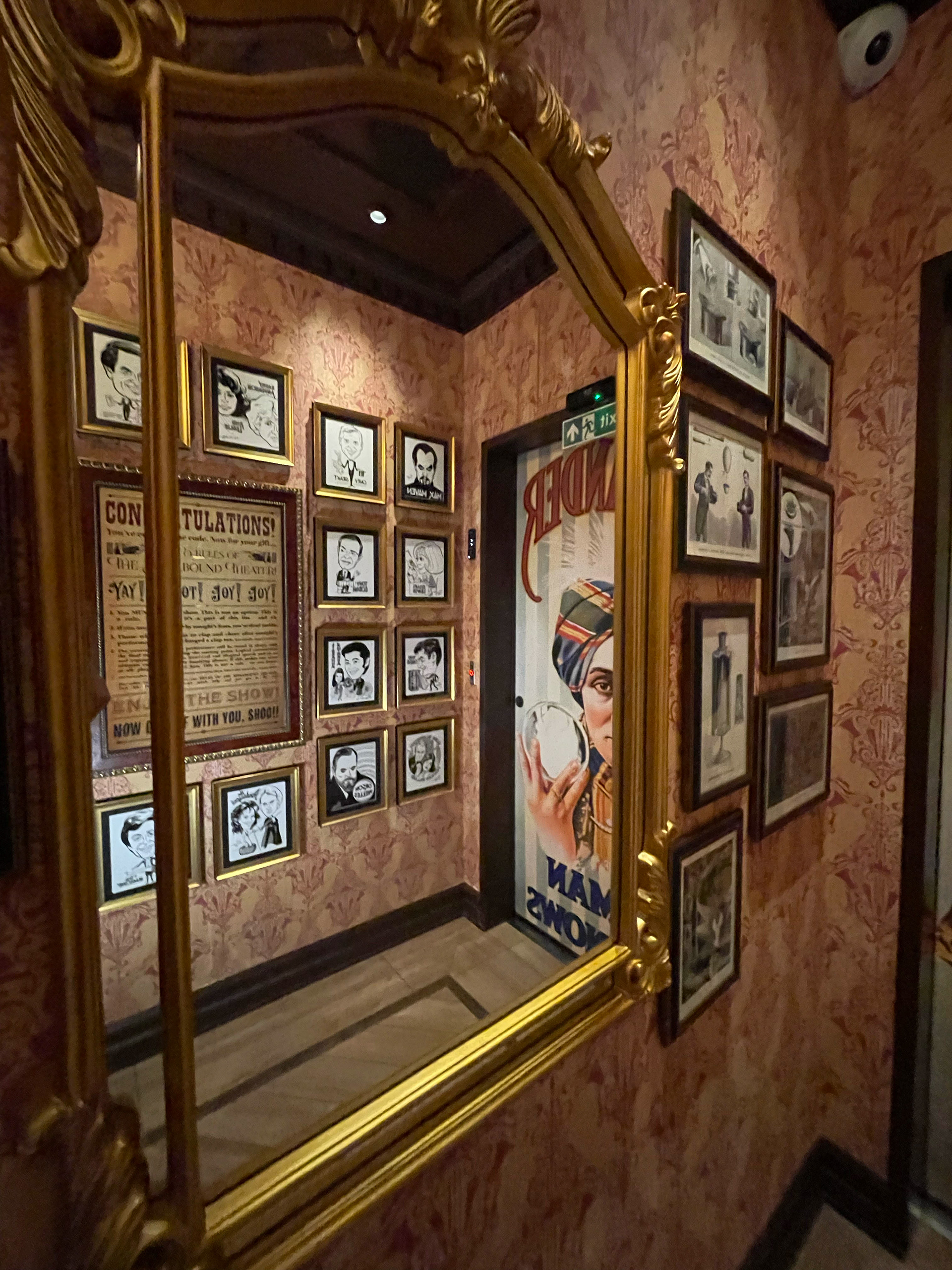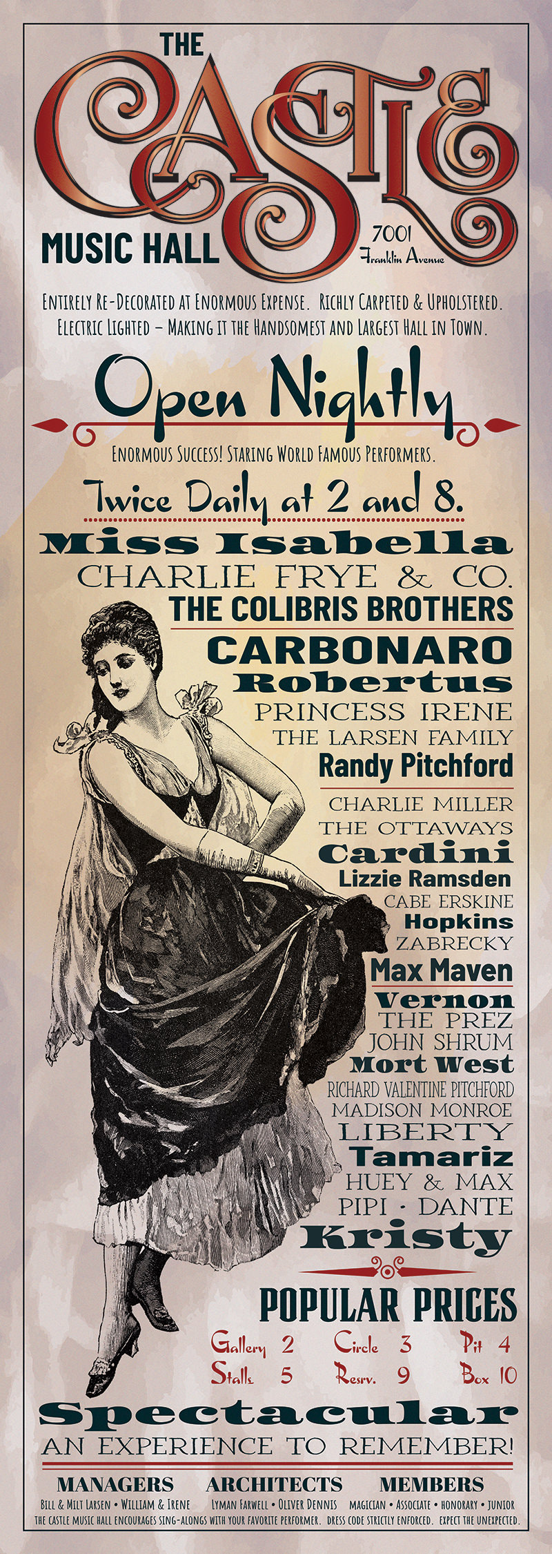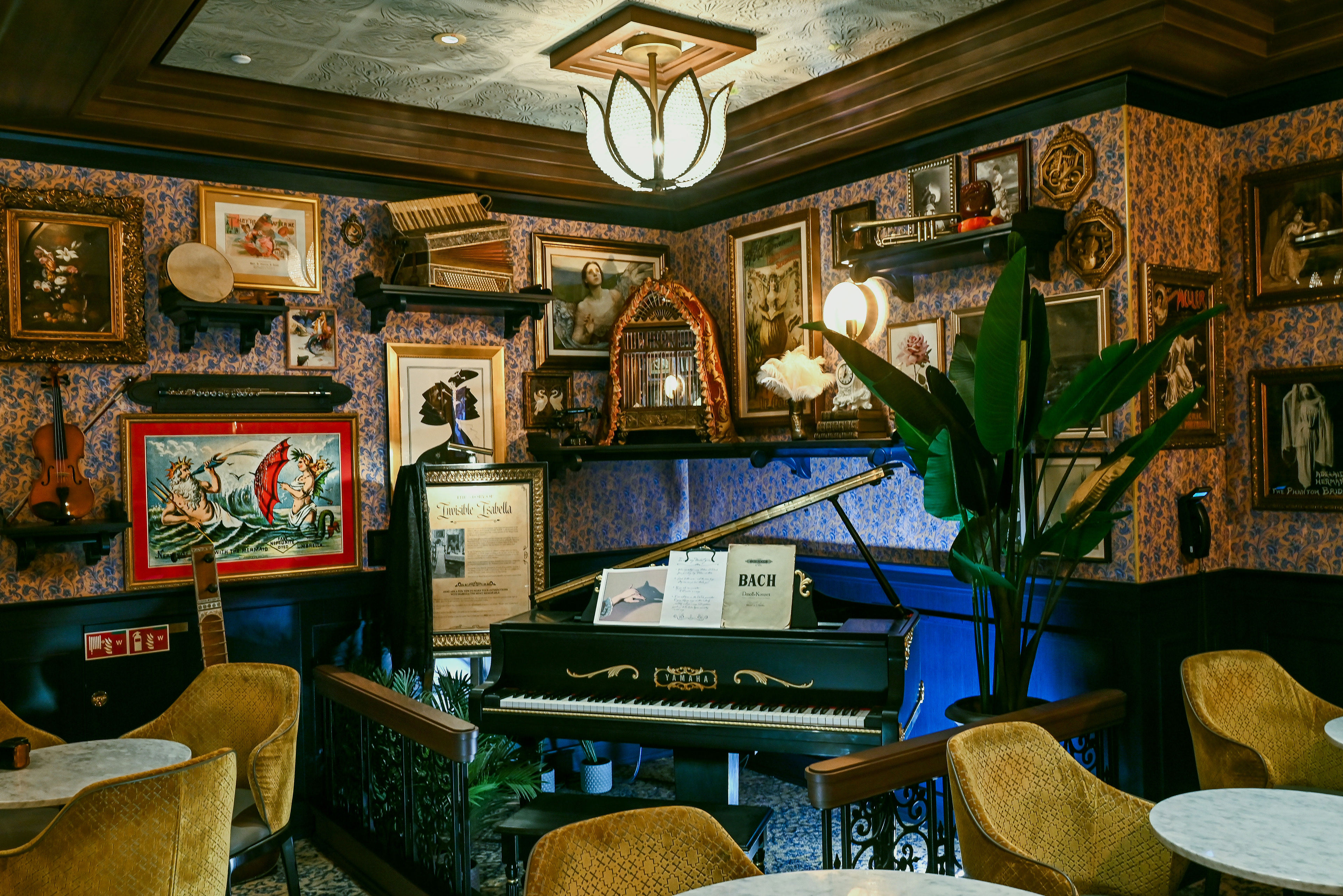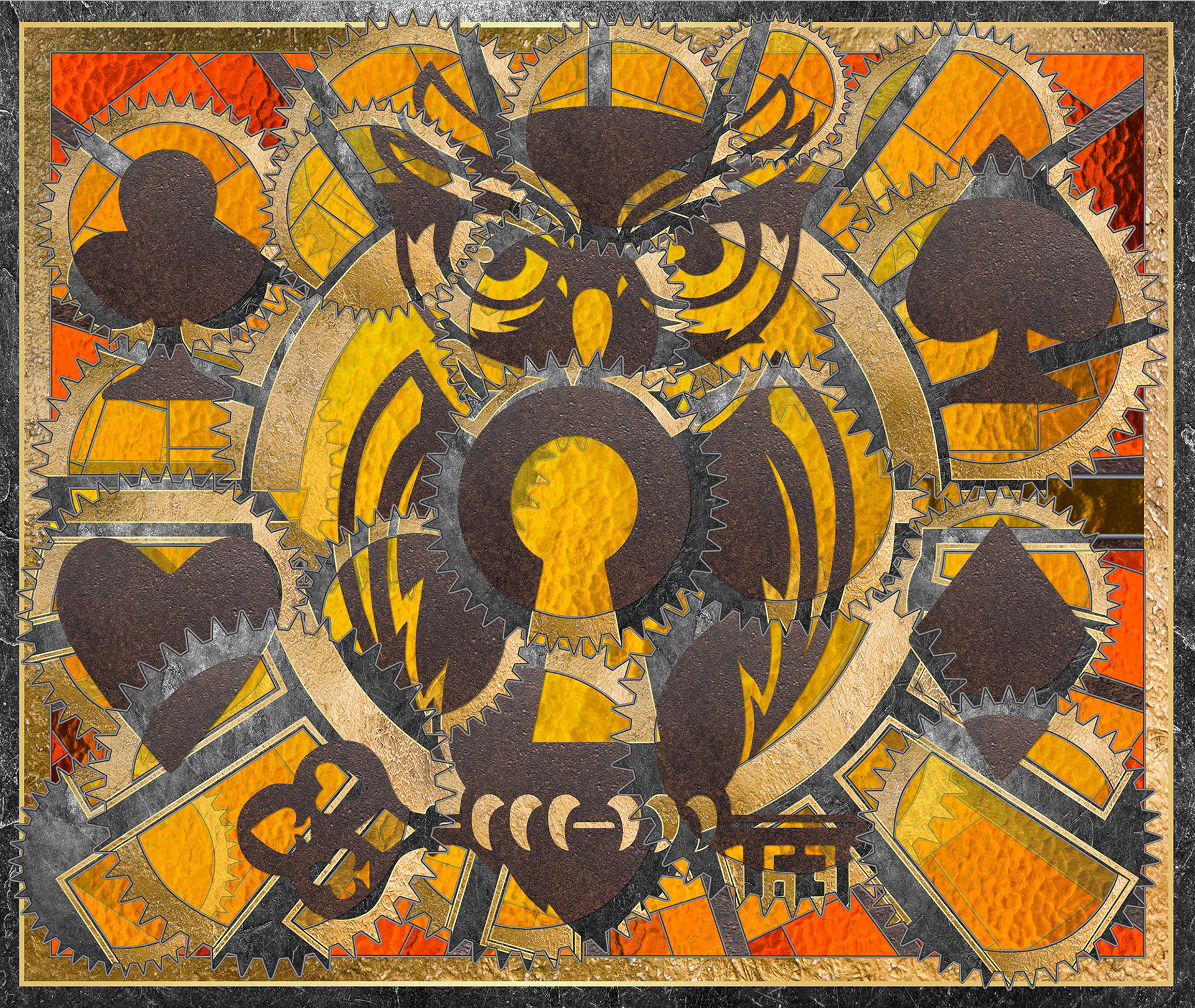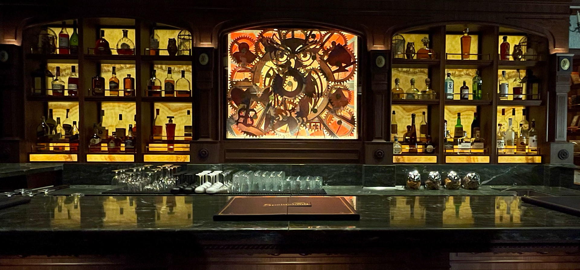 Stunning kinetic sculpture focal piece above the main bar. Comprised of 21 individual gears that rotate into place to form Archimedes, the icon of The Magic Castle.
