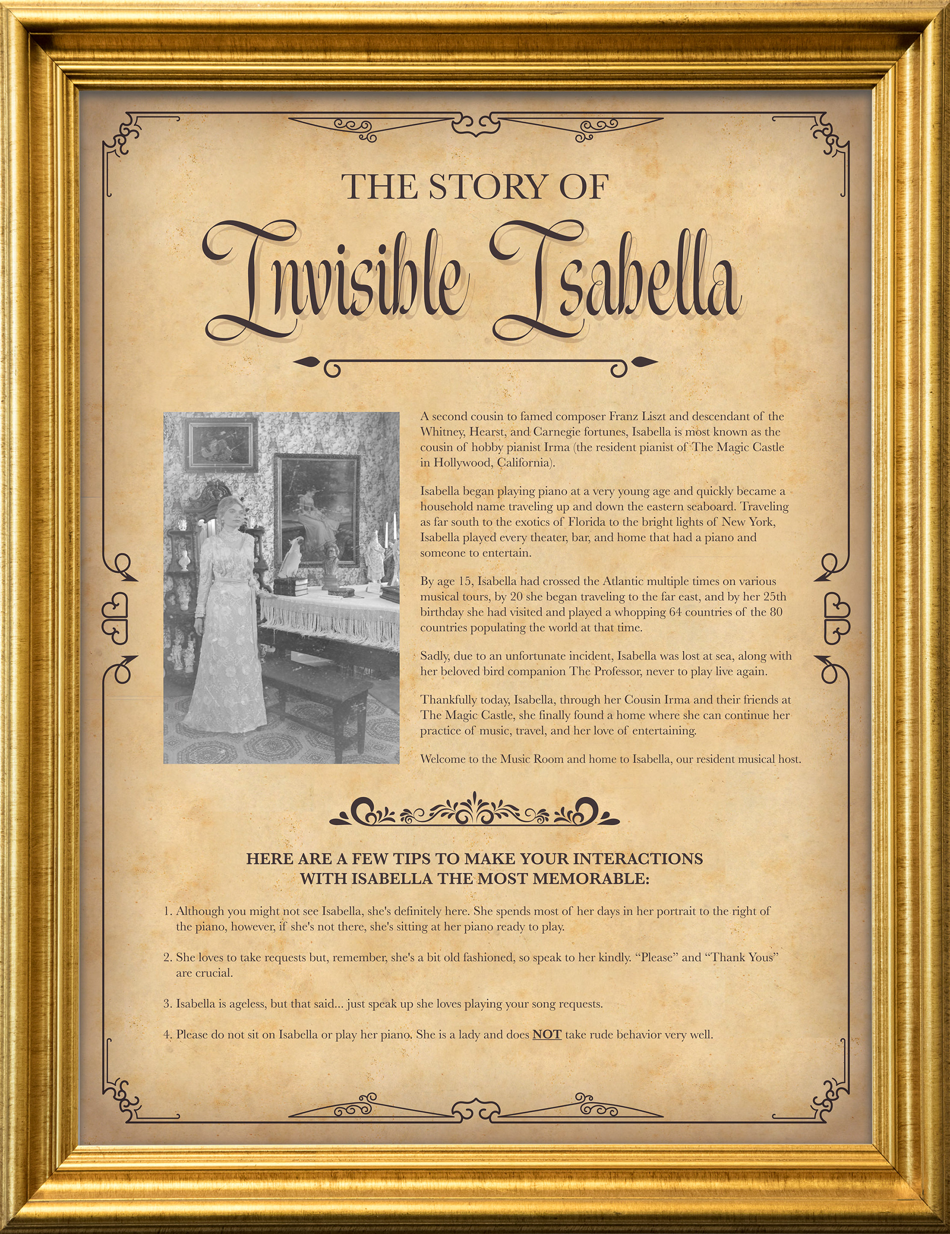 Poster telling the story of Invisible Isabella resides next to her enchanted piano