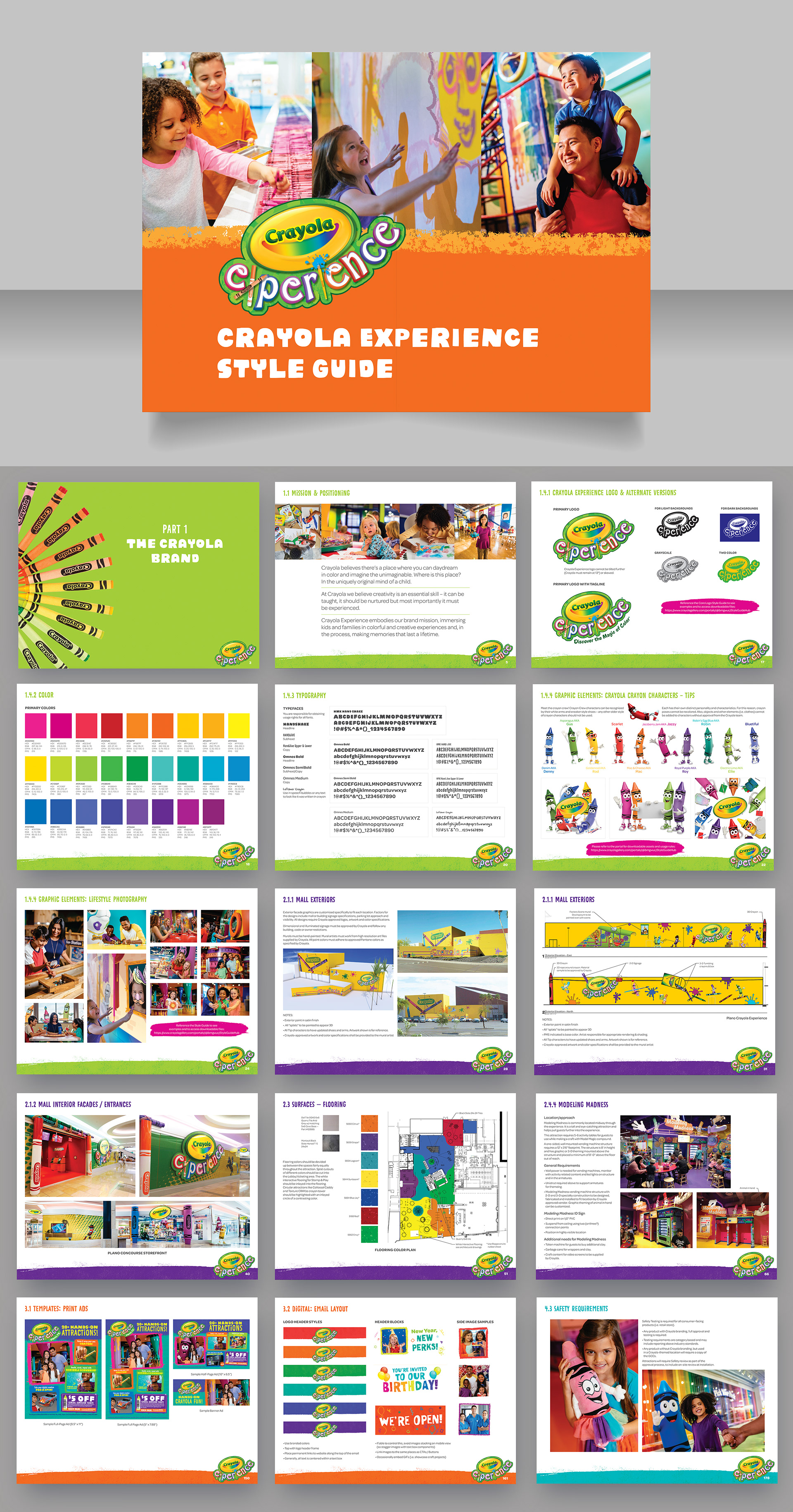 Worked as the liaison between Crayola's IP department and the Crayola Experience install teams to create a thoroughly comprehensive 180 page style guide. This included Crayola brand guidelines, scalable location installation requirements, marketing material templates and regulatory compliance needs.